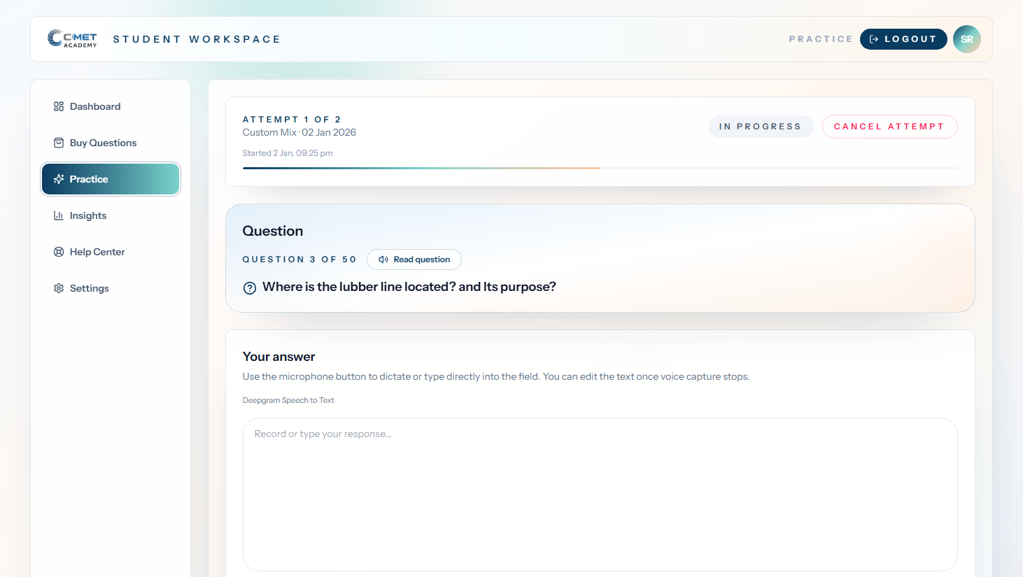 Curated question sets, voice or text answers, rubric-based AI scoring, and progress insights for students preparing across maritime, aviation, healthcare, logistics, and technical programs.